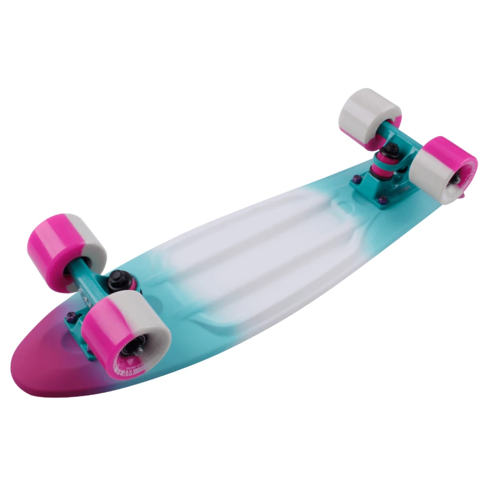 Скейтборд пластиковый MULTICOLOR 22" розово-бирюзовый – крутой круизер по привлекательной стоимости понравился начинающим райдерам и профи. Скейтборд создан с учетом требований ездоков и ошибок предыдущей модели. Яркий дизайн привлекает цветовыми гаммами, заставляет обратить внимание на пэнниборд и купить ее выгодно.