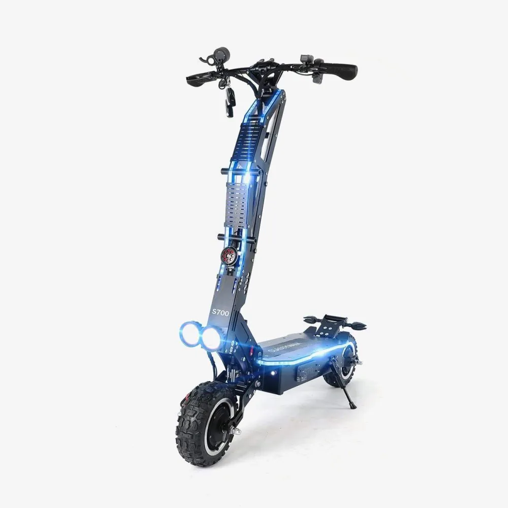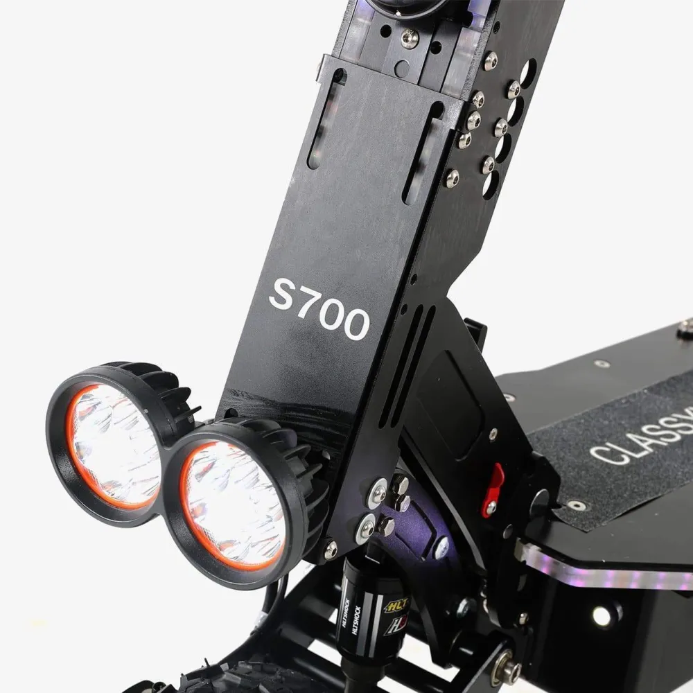 Емкость аккумулятора составляет 28 Ah, мощность двигателя 5600 W и вес 37 кг, что позволяет S700 DRAGON развивать скорость до 80 км/ч на пути до 80 км. Качественные моторы гарантируют ощутимую силу и энергию на дороге. Максимальный нагрузка составляет 150кг. Полный заряд батареи в данной модели - 12,5ч. Рамы электросамоката изготовлены из стали и авиационного алюминия. Электросамокат SLARDAR S700 DRAGON оснащен дисковой гидравлической и электронной тормозной системой, полным приводом и ярким освещением.