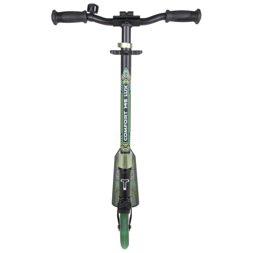 Самокат Comfort 145 Lux 2022 черно-зеленый – для мальчиков и девочек 5-летнего возраста стал настоящим сюрпризом. Характеристики техники обеспечивают стопроцентную безопасность ездока, позволяют совершенствовать навыки передвижения в пределах города и парковой зоны. Купить самокат по разумной цене, воспользоваться другими бонусами предлагает наш интернет-магазин.