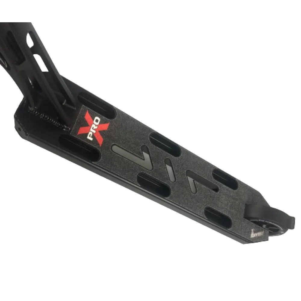 Трюковой самокат X-PRO черно-красный – техника с декой 120*528 мм (со скошенными дропами), сделанной из алюминиевой закалки 6061 Т6, свободно выдерживает вес пользователя массой до 100 кг. Модель приятно радует глаз цветовым оформлением и стильным дизайном. Плавность хода обеспечивается интегрированной рулевой стойкой и маневренным рулем Hro-Mo 620*700 мм (футспейс 450 мм).